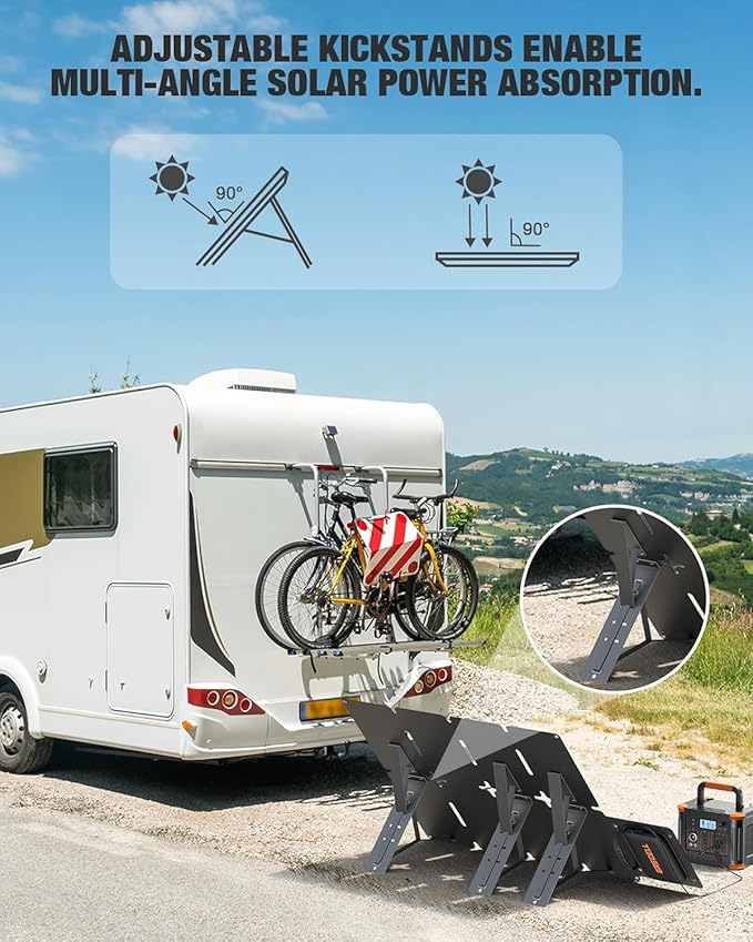 - 【Durable Kickstand & Easy Setup 】The Portable solar panel only weighs 9.26 lbs. Using the removable kickstands instead of laying the panel flat on the ground allows it to absorb 24% more sunlight. Unfold all the solar panels in outdoor sunlight, then connect your devices to the output ports, and get power in seconds. Note: this solar charger can't store electricity.