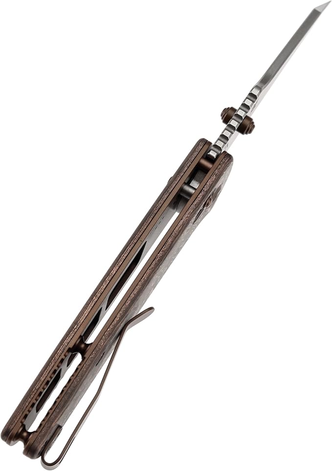 - Lightweight And Flexible Handle - The Copper Carbon Fiber handle with its specially finished surface is ergonomic and can be used even with sweaty palms and the large steel clip makes it easy to secure the knife. Compact and versatile, this folding knife fits in your pocket and is perfect for camping, hunting and outdoor adventures