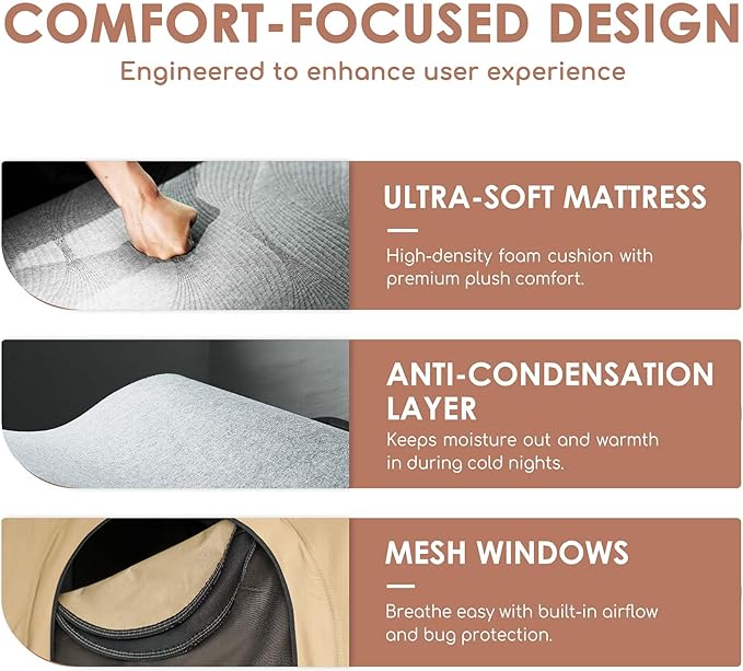 - Ultimate Comfort: This rooftop tent 89"L x 62"H x 50.5"W, comfortably fits 2 to 3 people, making it perfect for travel and camping. Four large windows offer great views and ventilation, while the mesh screens keep the interior protected. Inside, a high-density memory foam mattress and condensation pad ensure a dry, comfortable sleep. The blackout fabric and blackout layers coating effectively block sunlight. Even in the morning sunlight, the blackout layer keeps the interior dark and restful.