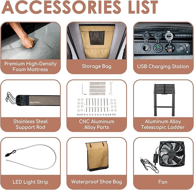 - Fully Equipped: This rooftop tent includes everything you need for outdoor comfort. A telescoping ladder makes entry easy, while built-in ports and LED strip lighting add convenience. A roof vent fan and anti-condensation pad keep the interior dry, and the soft memory foam mattress ensures restful sleep. A built-in zipper allows for easy attachment of an optional thermal liner. Storage and shoe bags keep things organized, and heavy-duty CNC aluminum hardware provides rock-solid stability.