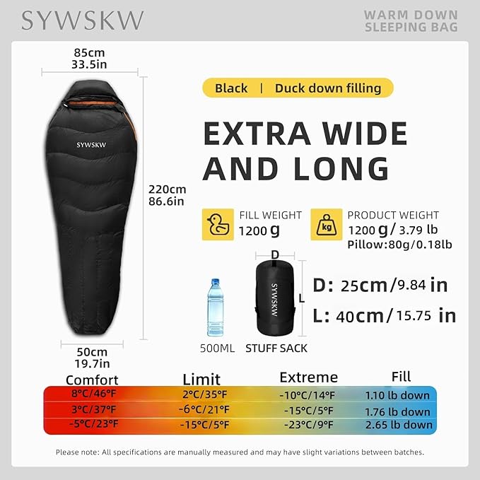 - Extra Wide and Long: The widened shoulders eliminate waist compression (86.6 in x 33.5 in). The sculpted baffles and double-stitched seams prevent cold spots, ensuring a comfortable sleep at every place,ideal for men and women height up to 78.8 inches, weight 220 lb