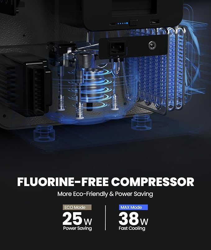 - 38W Ultra-Efficient Cooling:Choose between MAX mode (38W) for rapid cooling or ECO mode (25W) for energy savings. Even in MAX mode, it uses less than 0.5 kWh/day – one of the most efficient 12V fridges on the market. Pair it with a battery and solar panel for 24/7 cooling without electricity costs, saving you money in the long run