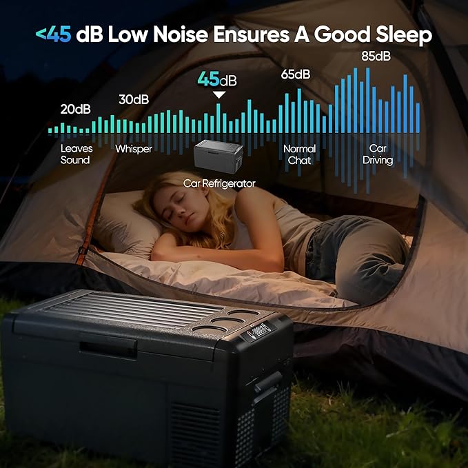 - 45dB Low Noise & Anti-Shaking: This portable freezer runs at just 45dB, ensuring quiet operation while driving or sleeping. With four fixed holes, it can be tied securely to stay stable even on 40° bumpy roads. As a reliable car cooler, it works smoothly outdoors while maintaining comfort and stability.