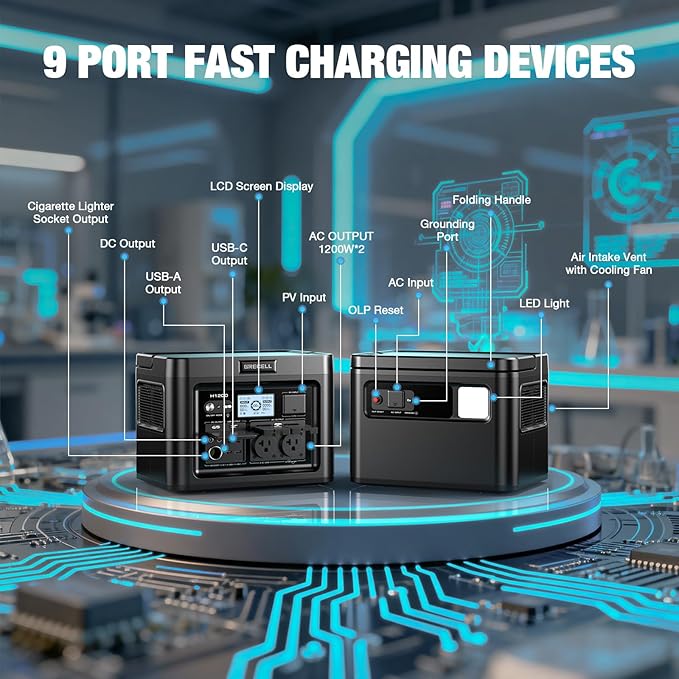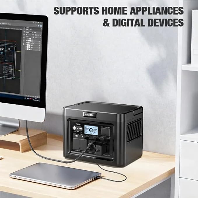 GRECELL H1200 Portable Power Station 1200W, 672Wh LiFePO4 Battery Solar Generator with 10ms UPS, 1200W Solar Power Station, 9 Output Ports for Home Emergency, Outdoor Camping, RV Travel, Laptop TV